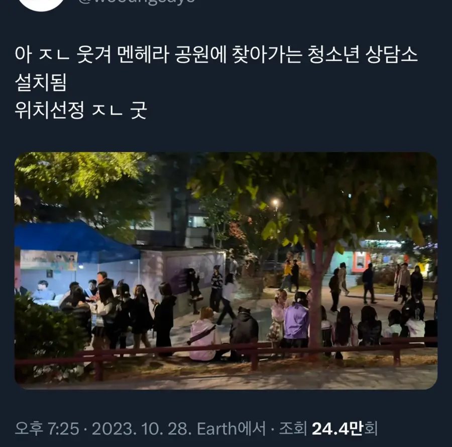 연예인 홍대에서 이상한 여자들 모이는거로 유명한 공원 근황 ㄷㄷㄷ..JPG[40] 페이지 정보 작성자 푸히헤헤햏ㅎ 댓글 0건 조회 309회 작성일 23-10-30 08:18 본문 청소년 상담소 설치됨바로앞 대기중 이전글이스타TV) 단군 : 야 겹치잖아!! 8번 20번!!! ㅋㅋㅋㅋㅋ[13] 다음글여성팬이 압도적으로 많다는 황희찬[37] 111222